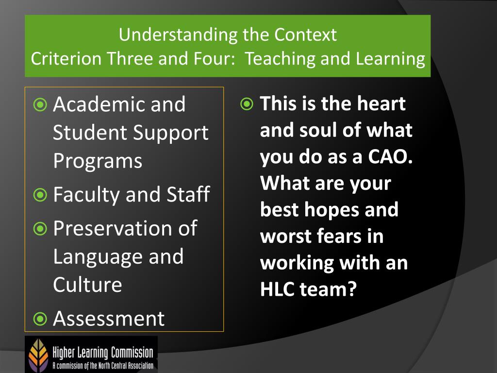 Understanding the ContextCriterion Three and Four: Teaching and Learning • Academic and Student Support Programs • Faculty and Staff • Preservation of Language and Culture • Assessment • This is the heart and soul of what you do as a CAO. What are your best hopes and worst fears in working with an HLC team?