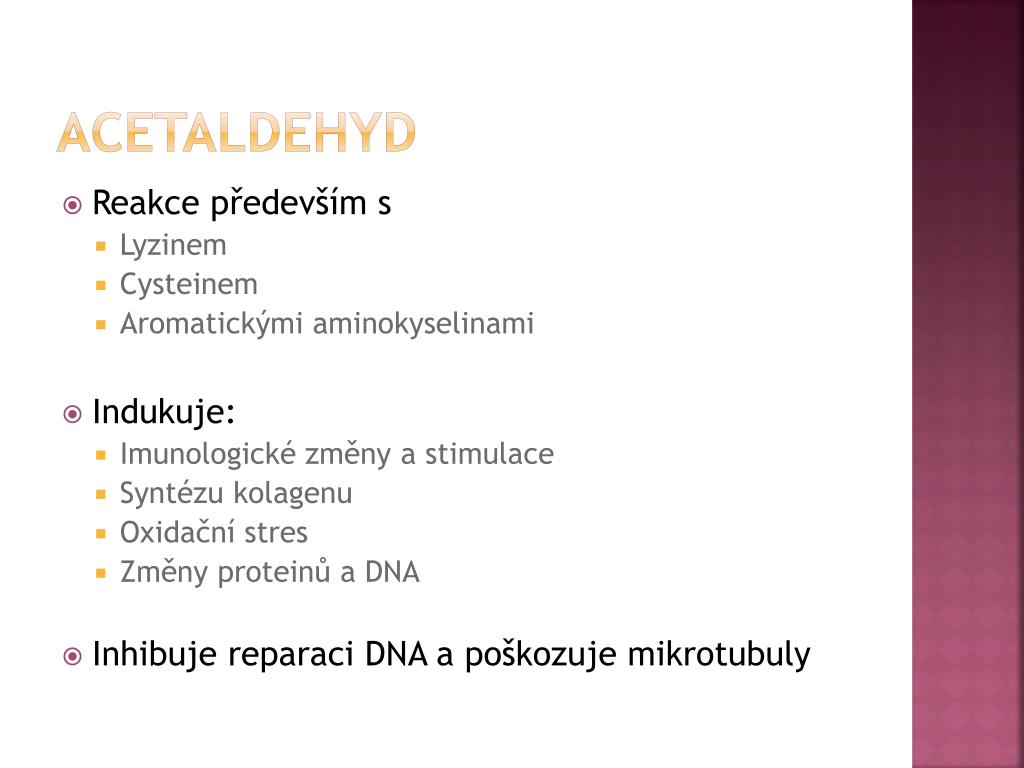 aCetaldehyd • Reakce především s • Lyzinem • Cysteinem • Aromatickými aminokyselinami • Indukuje: • Imunologické změny a stimulace • Syntézu kolagenu • Oxidační stres • Změny proteinů a DNA • Inhibuje reparaci DNA a poškozuje mikrotubuly