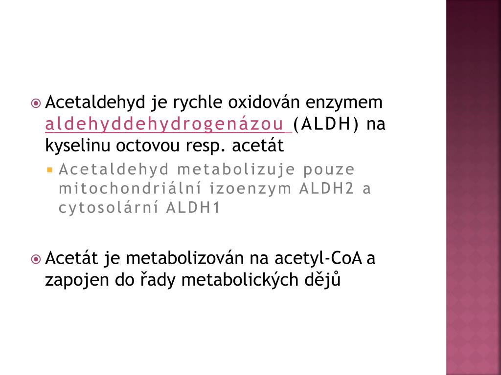 Acetaldehyd je rychle oxidován enzymem aldehyddehydrogenázou(ALDH) na kyselinu octovou resp. acetát • Acetaldehyd metabolizuje pouze mitochondriální izoenzym ALDH2 a cytosolární ALDH1 • Acetát je metabolizován na acetyl-CoA a zapojen do řady metabolických dějů
