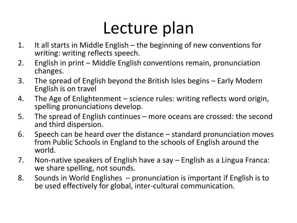 Lecture plan • It all starts in Middle English – the beginning of new conventions for writing: writing reflects speech. • English in print – Middle English conventions remain, pronunciation changes. • The spread of English beyond the British Isles begins – Early Modern English is on travel • The Age of Enlightenment – science rules: writing reflects word origin, spelling pronunciations develop. • The spread of English continues – more oceans are crossed: the second and third dispersion. • Speech can be heard over the distance – standard pronunciation moves from Public Schools in England to the schools of English around the world. • Non-native speakers of English have a say – English as a Lingua Franca: we share spelling, not sounds. • Sounds in World Englishes – pronunciation is important if English is to be used effectively for global, inter-cultural communication.