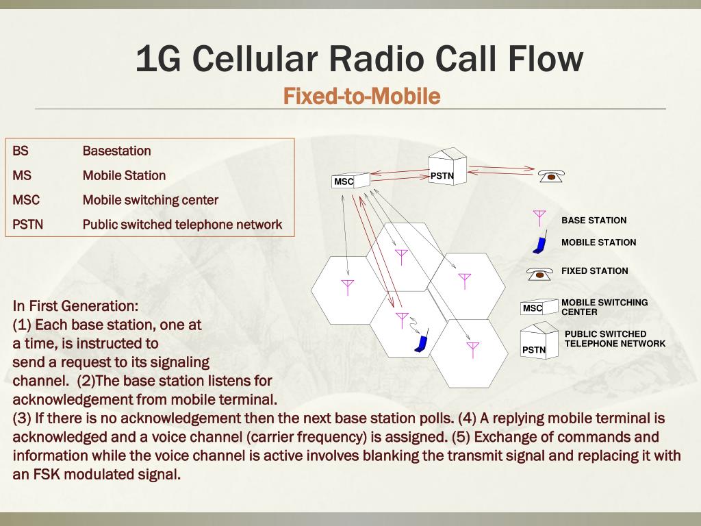 1G Cellular Radio Call FlowFixed-to-Mobile PSTN MSC BASE STATION MOBILE STATION FIXED STATION MOBILE SWITCHING MSC CENTER PUBLIC SWITCHED TELEPHONE NETWORK PSTN BS Basestation MS Mobile Station MSC Mobile switching center PSTN Public switched telephone network In First Generation: (1) Each base station, one at a time, is instructed to send a request to its signaling channel. (2)The base station listens for acknowledgement from mobile terminal. (3) If there is no acknowledgement then the next base station polls. (4) A replying mobile terminal is acknowledged and a voice channel (carrier frequency) is assigned. (5) Exchange of commands and information while the voice channel is active involves blanking the transmit signal and replacing it with an FSK modulated signal.