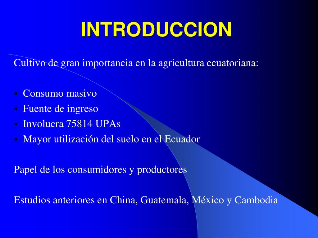 INTRODUCCION Cultivo de gran importancia en la agricultura ecuatoriana: Consumo masivo Fuente de ingreso Involucra 75814 UPAs Mayor utilización del suelo en el Ecuador Papel de los consumidores y productores Estudios anteriores en China, Guatemala, México y Cambodia