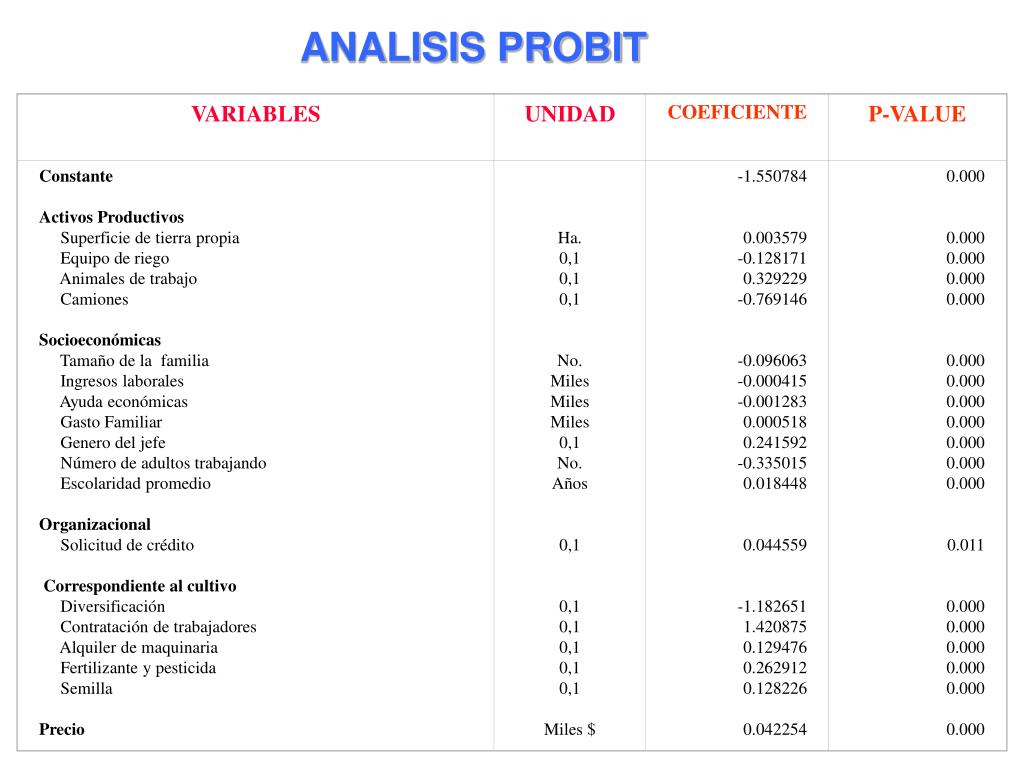 VARIABLES UNIDAD COEFICIENTE P-VALUE Constante Activos Productivos Superficie de tierra propia Equipo de riego Animales de trabajo Camiones Socioeconómicas Tamaño de la familia Ingresos laborales Ayuda económicas Gasto Familiar Genero del jefe Número de adultos trabajando Escolaridad promedio Organizacional Solicitud de crédito Correspondiente al cultivo Diversificación Contratación de trabajadores Alquiler de maquinaria Fertilizante y pesticida Semilla Precio Ha. 0,1 0,1 0,1 No. Miles Miles Miles 0,1 No. Años 0,1 0,1 0,1 0,1 0,1 0,1 Miles $ -1.550784 0.003579 -0.128171 0.329229 -0.769146 -0.096063 -0.000415 -0.001283 0.000518 0.241592 -0.335015 0.018448 0.044559 -1.182651 1.420875 0.129476 0.262912 0.128226 0.042254 0.000 0.000 0.000 0.000 0.000 0.000 0.000 0.000 0.000 0.000 0.000 0.000 0.011 0.000 0.000 0.000 0.000 0.000 0.000 ANALISIS PROBIT