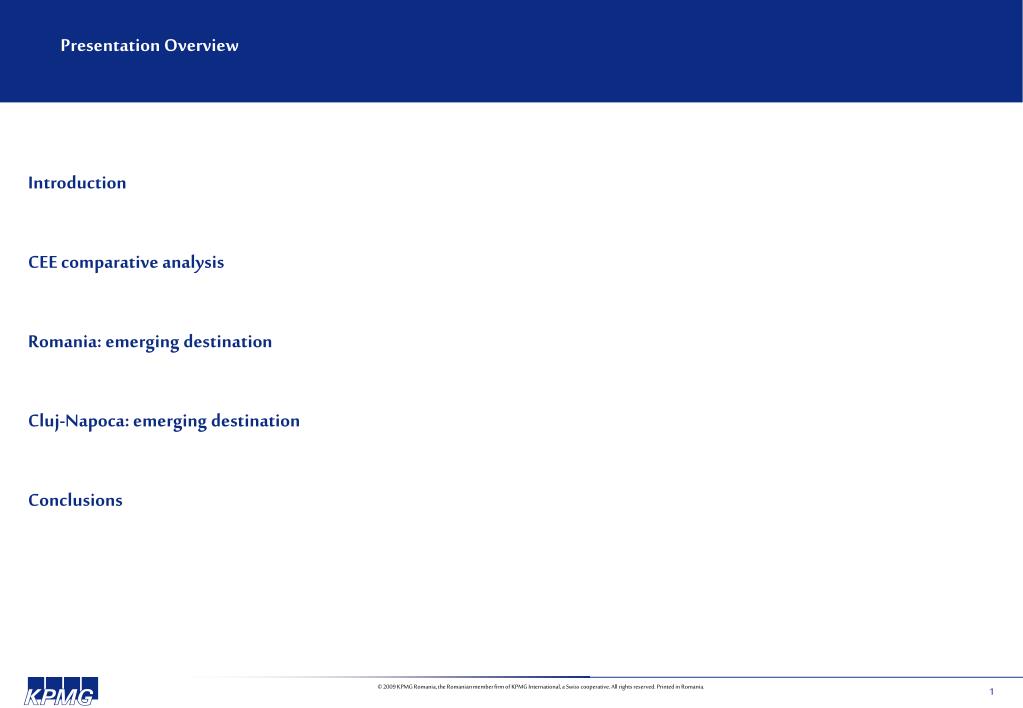 Outsourcing locations: Romania, Cluj- Napoca. 9 June 2009 Mihai Rada , KPMG Romania. Presentation Overview. Introduction CEE comparative analysis Romania: emerging destination Cluj-Napoca: emerging destination Conclusions. Introduction.