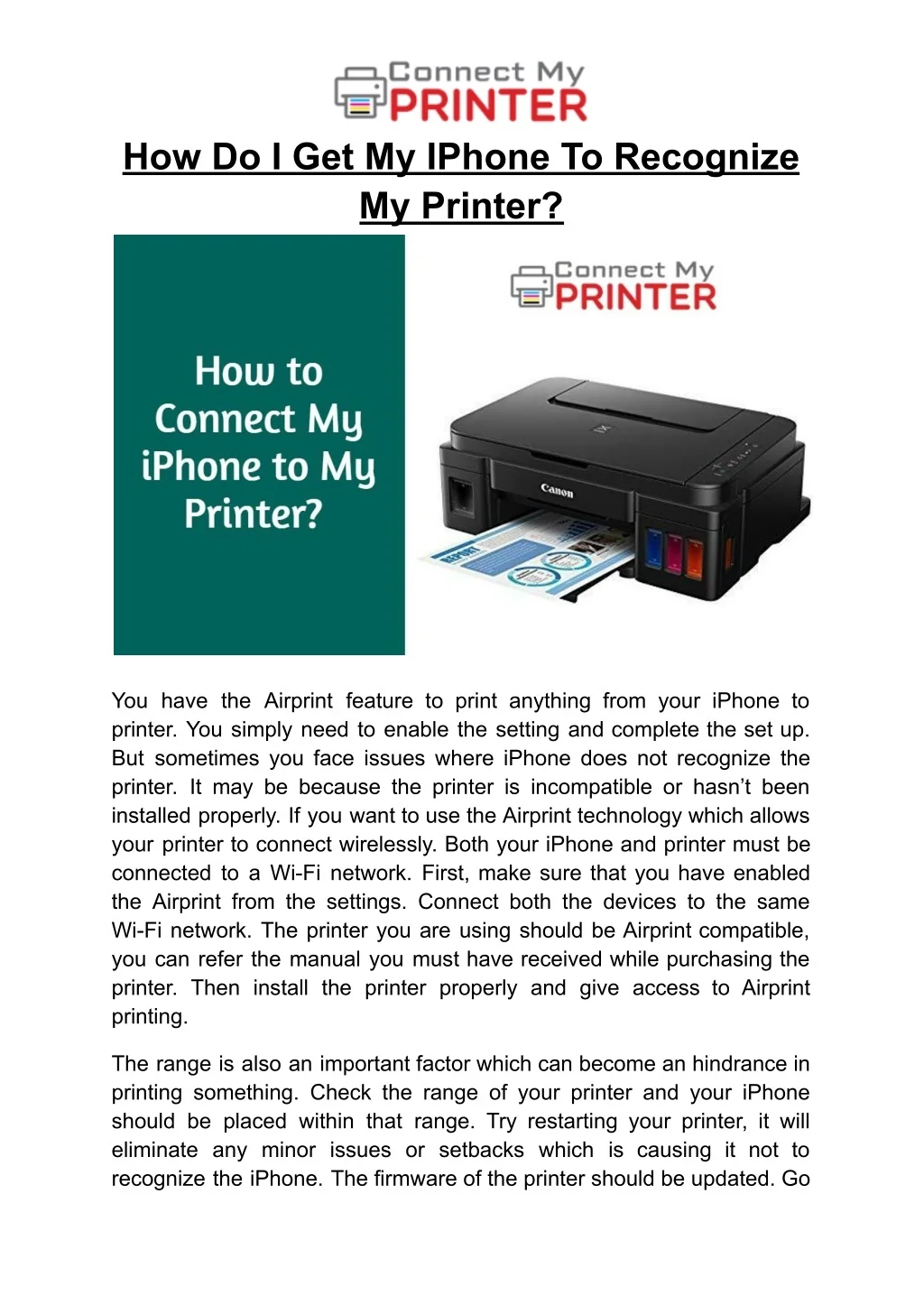 You have the Airprint feature to print anything from your iPhone to printer. You simply need to enable the setting and complete the set up. But sometimes you face issues where iPhone does not recognize the printer. It may be because the printer is incompatible or hasnu2019t been installed properly. If you want to use the Airprint technology which allows your printer to connect wirelessly. For more details read this document.<br><br>https://connectmyprinter.com/how-to-connect-canon-printer-to-iphone/