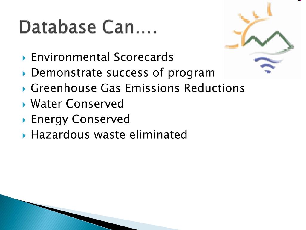 Database Can…. • Environmental Scorecards • Demonstrate success of program • Greenhouse Gas Emissions Reductions • Water Conserved • Energy Conserved • Hazardous waste eliminated