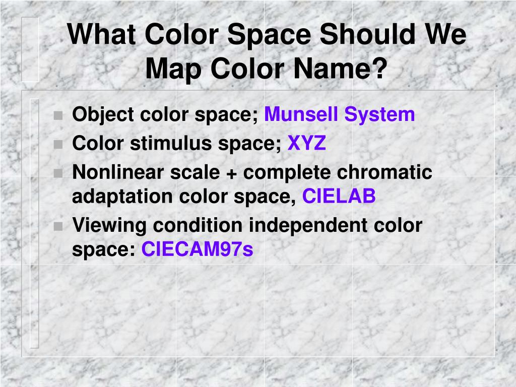 What Color Space Should We Map Color Name? • Object color space; Munsell System • Color stimulus space; XYZ • Nonlinear scale + complete chromatic adaptation color space, CIELAB • Viewing condition independent color space: CIECAM97s