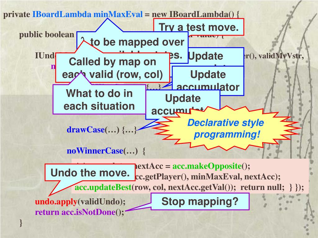 private IBoardLambda minMaxEval = new IBoardLambda() { • public boolean apply(board, acc, row, col, cell-value) { • IUndoMove undo =host.makeMove(row, col, acc.getPlayer(), validMvVstr, • new IBoardStatusVisitor() { • player0WonCase(...) {…} • player1WonCase(…) {…} • drawCase(…) {…} • noWinnerCase(…) { • undo.apply(validUndo); • return acc.isNotDone(); • } Try a test move. to be mapped over the available states. Update accumulator Called by map on each valid (row, col) Update accumulator What to do in each situation Update accumulator Declarative style programming! AAccumulator nextAcc = acc.makeOpposite(); host.map(nextAcc.getPlayer(), minMaxEval, nextAcc); acc.updateBest(row, col, nextAcc.getVal()); return null; } }); Undo the move. Stop mapping?