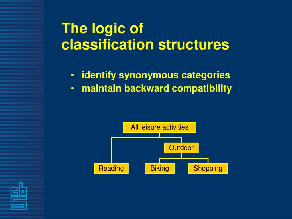 The logic ofclassification structures • identify synonymous categories • maintain backward compatibility
