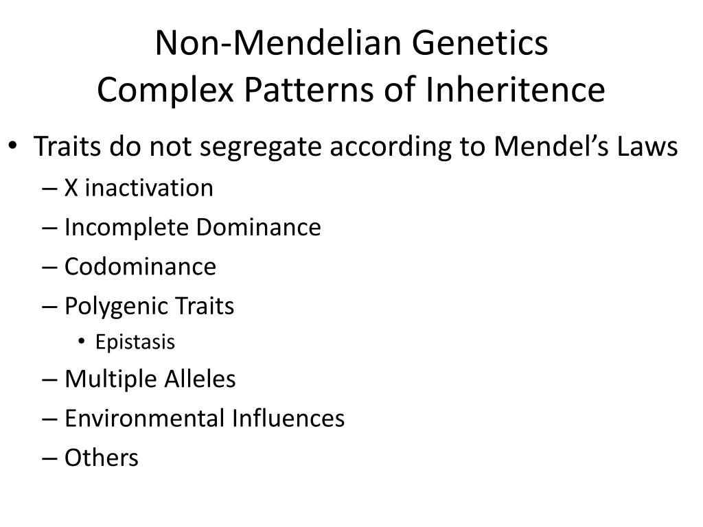 Non-Mendelian GeneticsComplex Patterns of Inheritence • Traits do not segregate according to Mendel’s Laws • X inactivation • Incomplete Dominance • Codominance • Polygenic Traits • Epistasis • Multiple Alleles • Environmental Influences • Others