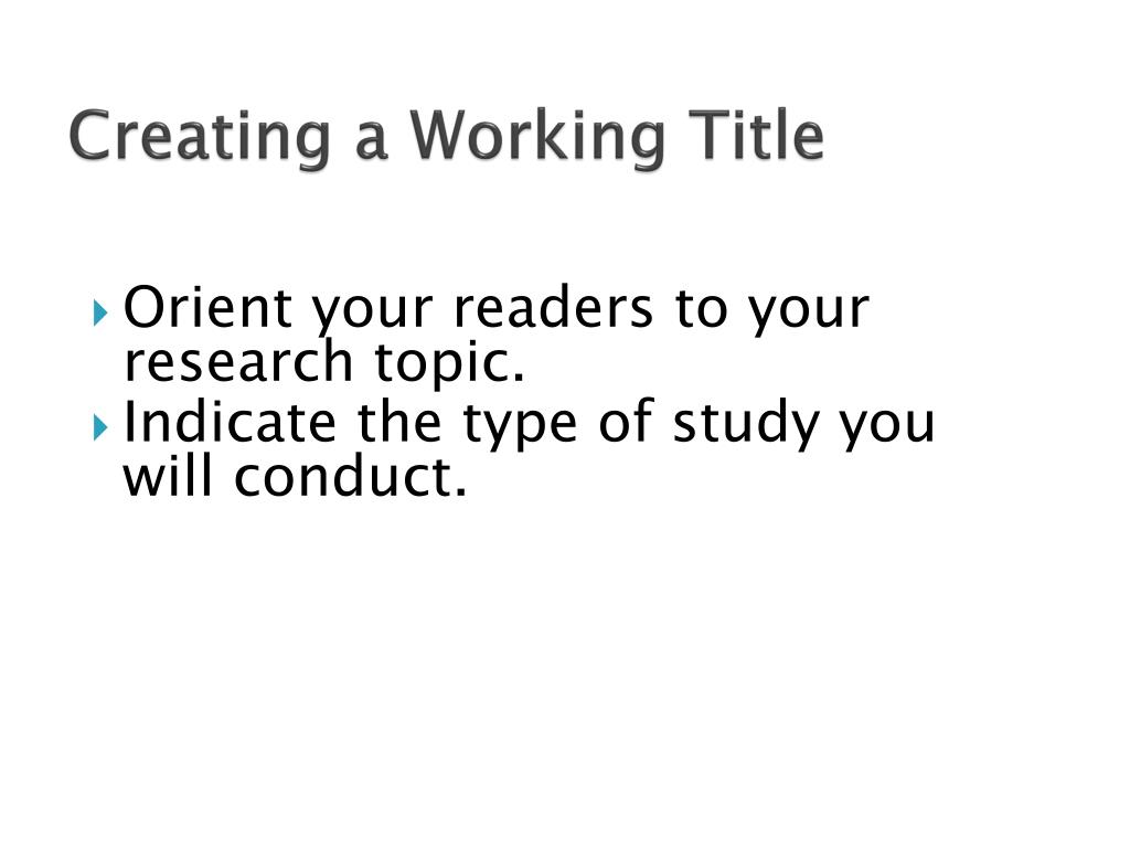 Creating a Working Title • Orient your readers to your research topic. • Indicate the type of study you will conduct.