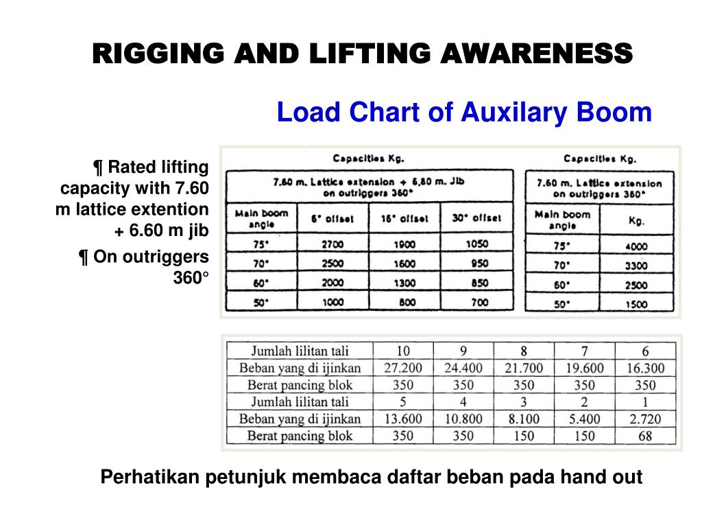 RIGGING AND LIFTING AWARENESS Load Chart of Auxilary Boom ¶ Rated lifting capacity with 7.60 m lattice extention + 6.60 m jib ¶ On outriggers 360° Perhatikan petunjuk membaca daftar beban pada hand out