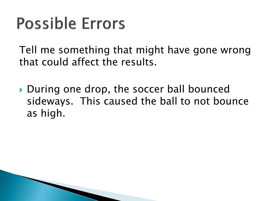 Possible Errors Tell me something that might have gone wrong that could affect the results. • During one drop, the soccer ball bounced sideways. This caused the ball to not bounce as high.