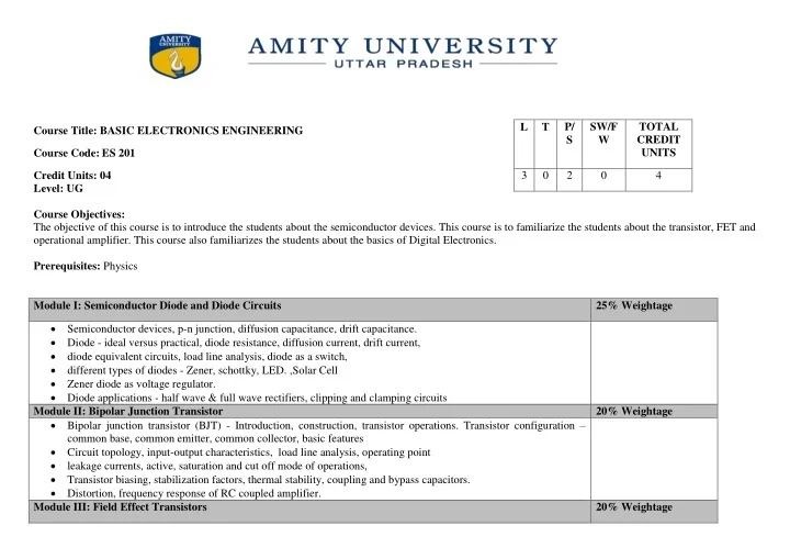 Course Title: BASIC ELECTRONICS ENGINEERING P/ S SW/F W TOTAL CREDIT UNITS L T Course Code:ES 201 Credit Units: 04 Level: UG Course Objectives: The objective of this course is to introduce the students about the semiconductor devices. This course is to familiarize the students about the transistor, FET and operational amplifier. This course also familiarizes the students about the basics of Digital Electronics. Prerequisites: Physics Module I: Semiconductor Diode and Diode Circuits 3 0 2 0 4 25% Weightage Semiconductor devices, p-n junction, diffusion capacitance, drift capacitance. Diode - ideal versus practical, diode resistance, diffusion current, drift current, diode equivalent circuits, load line analysis, diode as a switch, different types of diodes - Zener, schottky, LED. ,Solar Cell Zener diode as voltage regulator. Diode applications - half wave & full wave rectifiers, clipping and clamping circuits Module II: Bipolar Junction Transistor Bipolar junction transistor (BJT) - Introduction, construction, transistor operations. Transistor configuration – common base, common emitter, common collector, basic features Circuit topology, input-output characteristics, load line analysis, operating point leakage currents, active, saturation and cut off mode of operations, Transistor biasing, stabilization factors, thermal stability, coupling and bypass capacitors. Distortion, frequency response of RC coupled amplifier. Module III: Field Effect Transistors 20% Weightage 20% Weightage