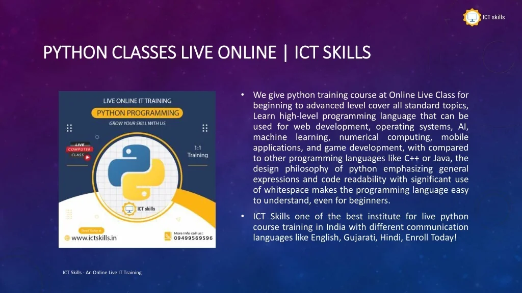 PYTHON CLASSES LIVE ONLINE | ICT SKILLS PYTHON CLASSES LIVE ONLINE | ICT SKILLS • We give python training course at Online Live Class for beginning to advanced level cover all standard topics, Learn high-level programming language that can be used for web development, operating systems, AI, machine learning, numerical computing, mobile applications, and game development, with compared to other programming languages like C++ or Java, the design philosophy of python emphasizing general expressions and code readability with significant use of whitespace makes the programming language easy to understand, even for beginners. • ICT Skills one of the best institute for live python course training in India with different communication languages like English, Gujarati, Hindi, Enroll Today! ICT Skills - An Online Live IT Training