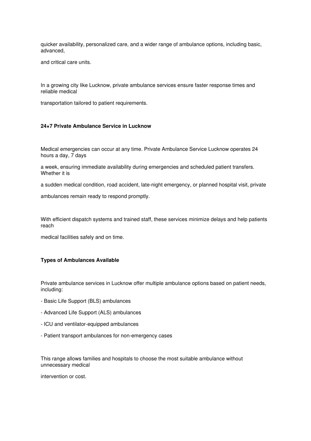 quicker availability, personalized care, and a wider range of ambulance options, including basic, advanced, and critical care units. In a growing city like Lucknow, private ambulance services ensure faster response times and reliable medical transportation tailored to patient requirements. 24×7 Private Ambulance Service in Lucknow Medical emergencies can occur at any time. Private Ambulance Service Lucknow operates 24 hours a day, 7 days a week, ensuring immediate availability during emergencies and scheduled patient transfers. Whether it is a sudden medical condition, road accident, late-night emergency, or planned hospital visit, private ambulances remain ready to respond promptly. With efficient dispatch systems and trained staff, these services minimize delays and help patients reach medical facilities safely and on time. Types of Ambulances Available Private ambulance services in Lucknow offer multiple ambulance options based on patient needs, including: - Basic Life Support (BLS) ambulances - Advanced Life Support (ALS) ambulances - ICU and ventilator-equipped ambulances - Patient transport ambulances for non-emergency cases This range allows families and hospitals to choose the most suitable ambulance without unnecessary medical intervention or cost.