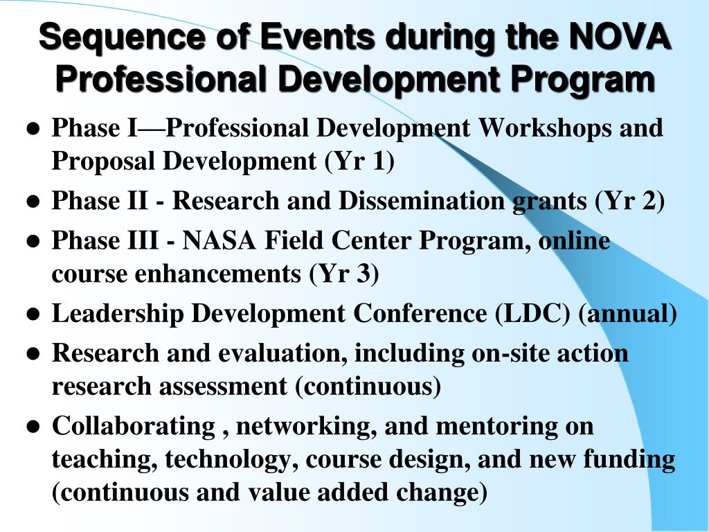 Sequence of Events during the NOVA Professional Development Program • Phase I—Professional Development Workshops and Proposal Development (Yr 1) • Phase II - Research and Dissemination grants (Yr 2) • Phase III - NASA Field Center Program, online course enhancements (Yr 3) • Leadership Development Conference (LDC) (annual) • Research and evaluation, including on-site action research assessment (continuous) • Collaborating , networking, and mentoring on teaching, technology, course design, and new funding (continuous and value added change)