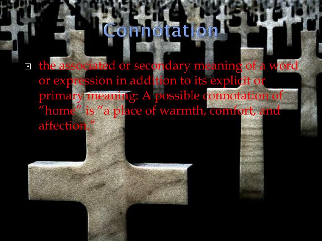 Connotation • the associated or secondary meaning of a word or expression in addition to its explicit or primary meaning: A possible connotation of “home” is “a place of warmth, comfort, and affection.”