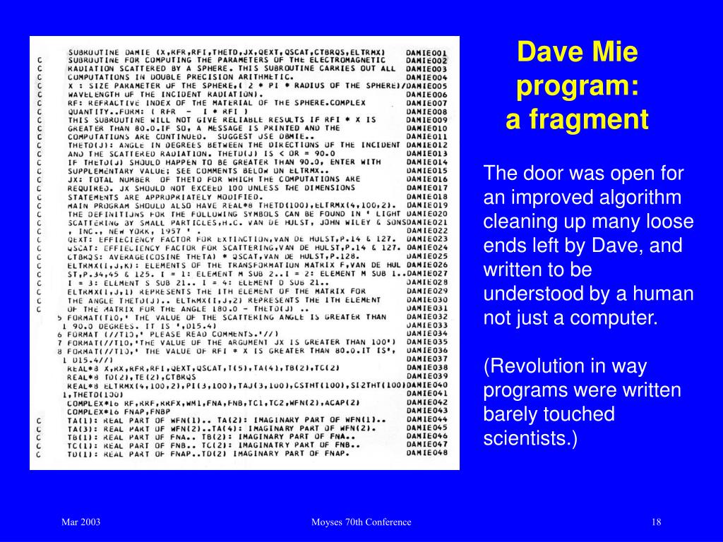 Dave Mie program: a fragment The door was open for an improved algorithm cleaning up many loose ends left by Dave, and written to be understood by a human not just a computer. (Revolution in way programs were written barely touched scientists.) Moyses 70th Conference