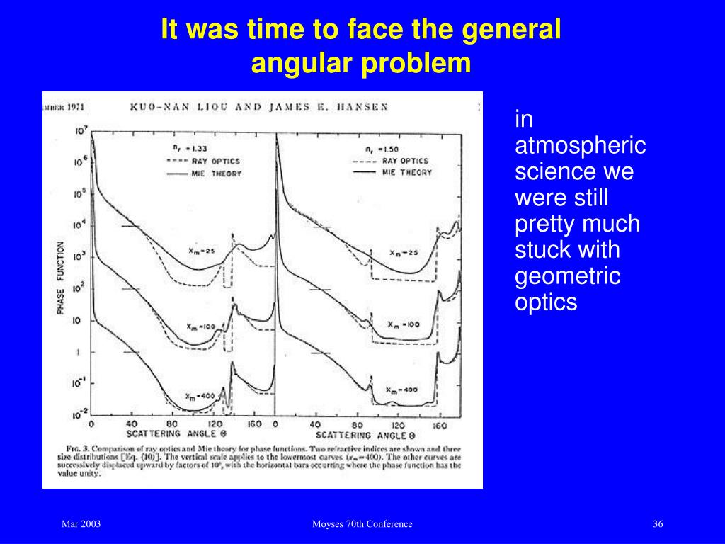 It was time to face the general angular problem in atmospheric science we were still pretty much stuck with geometric optics Moyses 70th Conference