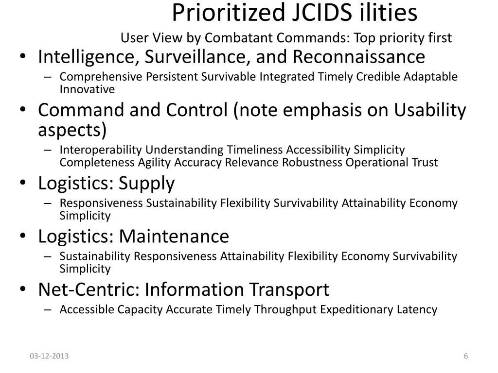 Prioritized JCIDS ilitiesUser View by Combatant Commands: Top priority first • Intelligence, Surveillance, and Reconnaissance • Comprehensive Persistent Survivable Integrated Timely Credible Adaptable Innovative • Command and Control (note emphasis on Usability aspects) • Interoperability Understanding Timeliness Accessibility Simplicity Completeness Agility Accuracy Relevance Robustness Operational Trust • Logistics: Supply • Responsiveness Sustainability Flexibility Survivability Attainability Economy Simplicity • Logistics: Maintenance • Sustainability Responsiveness Attainability Flexibility Economy Survivability Simplicity • Net-Centric: Information Transport • Accessible Capacity Accurate Timely Throughput Expeditionary Latency