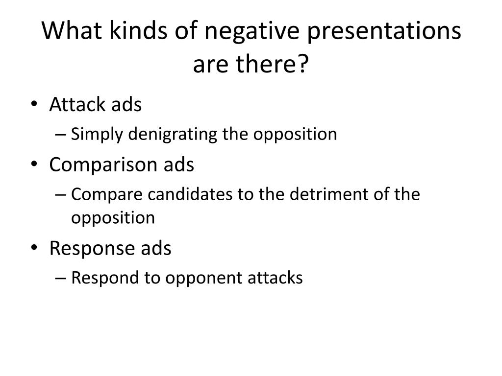 What kinds of negative presentations are there? • Attack ads • Simply denigrating the opposition • Comparison ads • Compare candidates to the detriment of the opposition • Response ads • Respond to opponent attacks