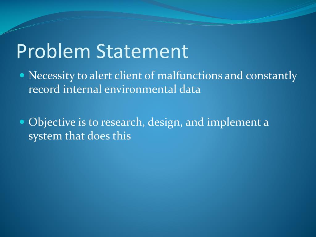 Problem Statement • Necessity to alert client of malfunctions and constantly record internal environmental data • Objective is to research, design, and implement a system that does this