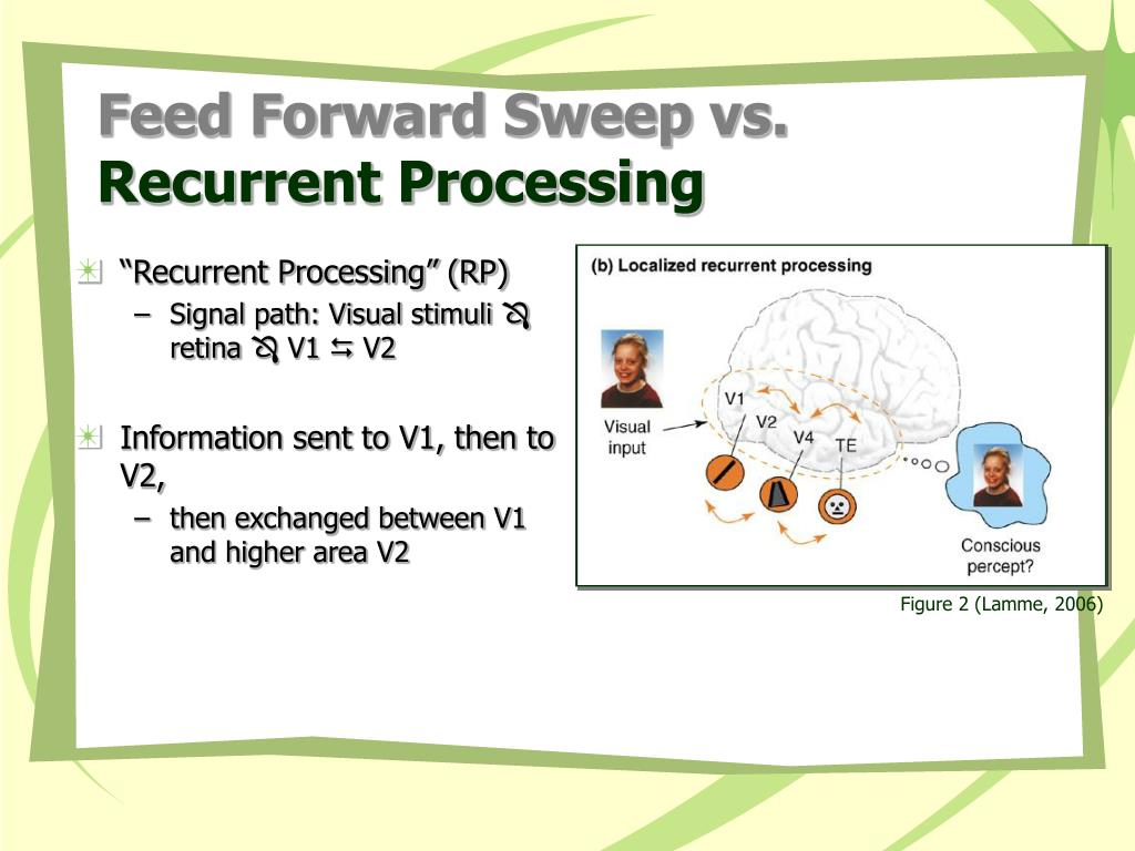 Feed Forward Sweep vs. Recurrent Processing • “Recurrent Processing” (RP) • Signal path: Visual stimuli retina V1 V2 • Information sent to V1, then to V2, • then exchanged between V1 and higher area V2 Figure 2 (Lamme, 2006)