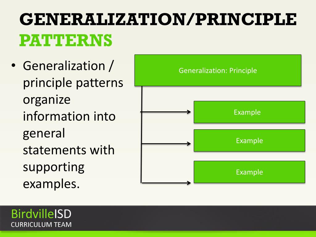 GENERALIZATION/PRINCIPLE PATTERNS Generalization: Principle • Generalization / principle patterns organize information into general statements with supporting examples. Example Example Example