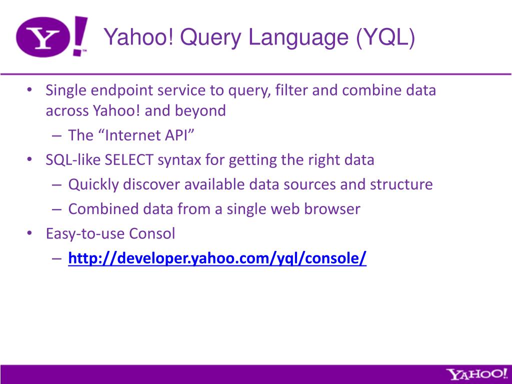 Yahoo! Query Language (YQL) • Single endpoint service to query, filter and combine data across Yahoo! and beyond • The “Internet API” • SQL-like SELECT syntax for getting the right data • Quickly discover available data sources and structure • Combined data from a single web browser • Easy-to-use Consol • http://developer.yahoo.com/yql/console/