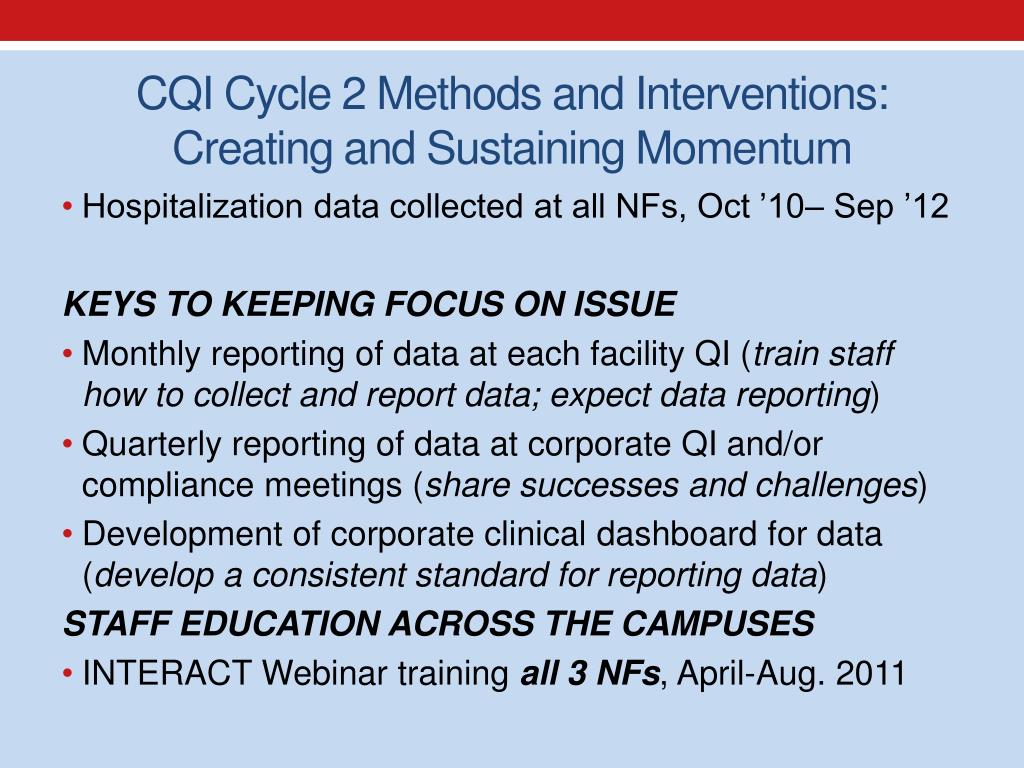 CQI Cycle 2 Methods and Interventions:Creating and Sustaining Momentum • Hospitalization data collected at all NFs, Oct ’10– Sep ’12 KEYS TO KEEPING FOCUS ON ISSUE • Monthly reporting of data at each facility QI (train staff how to collect and report data; expect data reporting) • Quarterly reporting of data at corporate QI and/or compliance meetings (share successes and challenges) • Development of corporate clinical dashboard for data (develop a consistent standard for reporting data) STAFF EDUCATION ACROSS THE CAMPUSES • INTERACT Webinar training all 3 NFs, April-Aug. 2011