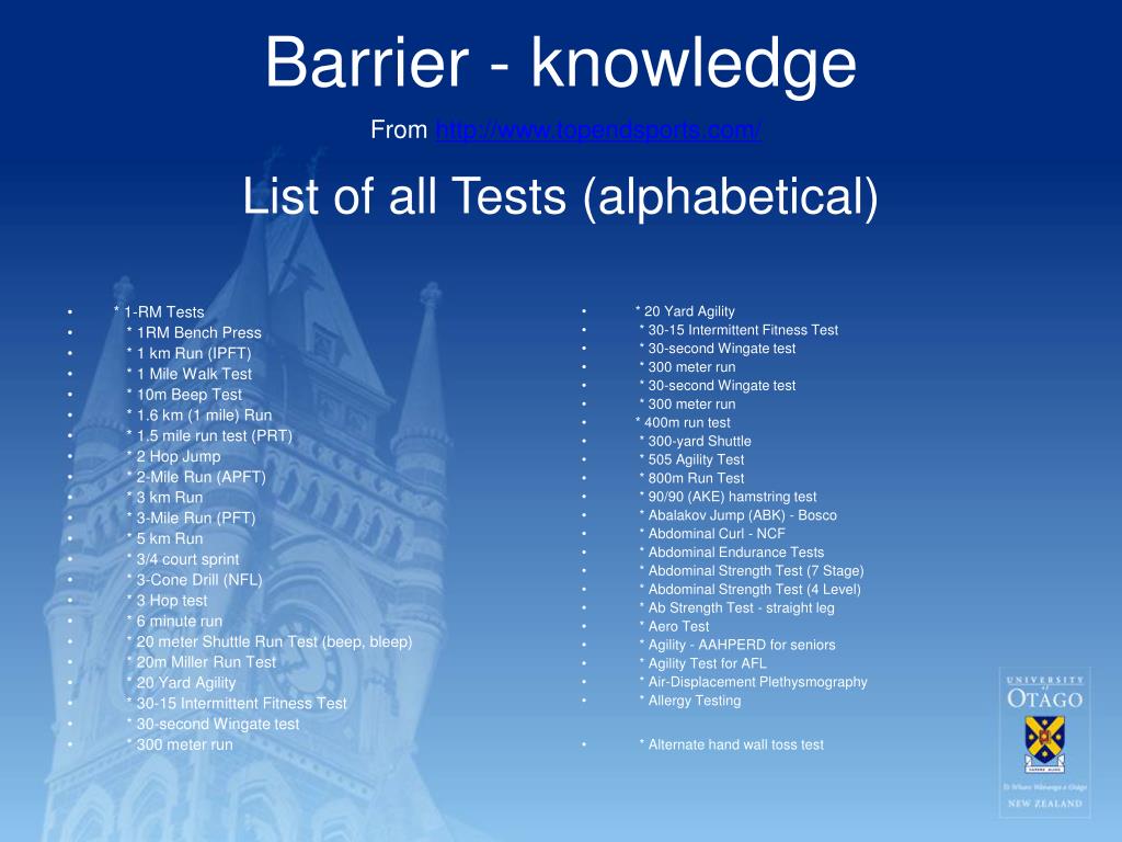 * 1-RM Tests * 1RM Bench Press * 1 km Run (IPFT) * 1 Mile Walk Test * 10m Beep Test * 1.6 km (1 mile) Run * 1.5 mile run test (PRT) * 2 Hop Jump * 2-Mile Run (APFT) * 3 km Run * 3-Mile Run (PFT) * 5 km Run * 3/4 court sprint * 3-Cone Drill (NFL) * 3 Hop test * 6 minute run * 20 meter Shuttle Run Test (beep, bleep) * 20m Miller Run Test * 20 Yard Agility * 30-15 Intermittent Fitness Test * 30-second Wingate test * 300 meter run * 20 Yard Agility * 30-15 Intermittent Fitness Test * 30-second Wingate test * 300 meter run * 30-second Wingate test * 300 meter run * 400m run test * 300-yard Shuttle * 505 Agility Test * 800m Run Test * 90/90 (AKE) hamstring test * Abalakov Jump (ABK) - Bosco * Abdominal Curl - NCF * Abdominal Endurance Tests * Abdominal Strength Test (7 Stage) * Abdominal Strength Test (4 Level) * Ab Strength Test - straight leg * Aero Test * Agility - AAHPERD for seniors * Agility Test for AFL * Air-Displacement Plethysmography * Allergy Testing * Alternate hand wall toss test Barrier - knowledgeFrom http://www.topendsports.com/List of all Tests (alphabetical)