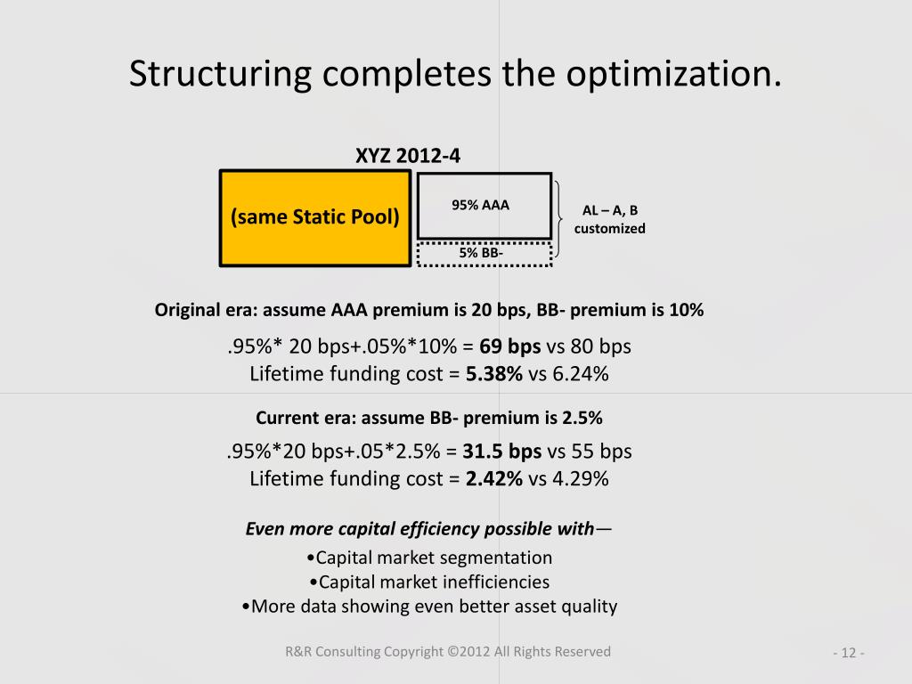 Structuring completes the optimization. XYZ 2012-4 (same Static Pool) 95% AAA AL – A, B customized 5% BB- • Original era: assume AAA premium is 20 bps, BB- premium is 10% • .95%* 20 bps+.05%*10% = 69 bps vs 80 bps • Lifetime funding cost = 5.38% vs 6.24% • Current era: assume BB- premium is 2.5% • .95%*20 bps+.05*2.5% = 31.5 bps vs 55 bps • Lifetime funding cost = 2.42% vs 4.29% • Even more capital efficiency possible with— • Capital market segmentation • Capital market inefficiencies • More data showing even better asset quality