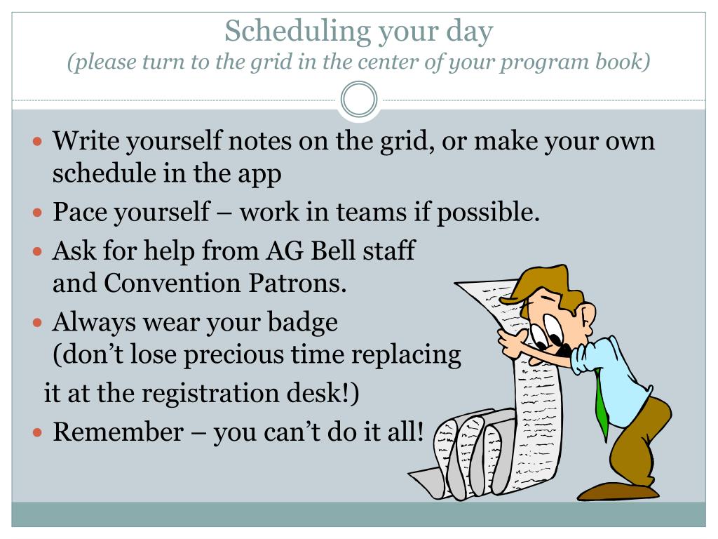 Scheduling your day(please turn to the grid in the center of your program book) Write yourself notes on the grid, or make your own schedule in the app Pace yourself – work in teams if possible. Ask for help from AG Bell staff and Convention Patrons. Always wear your badge (don’t lose precious time replacing it at the registration desk!) Remember – you can’t do it all!