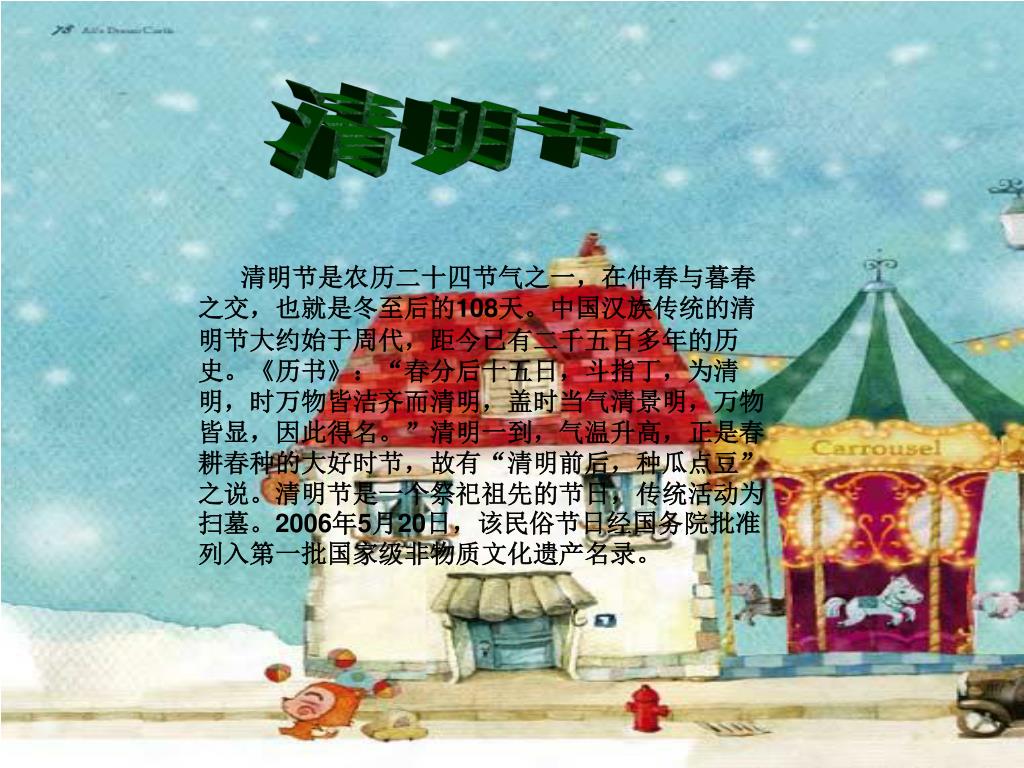 清明节 清明节是农历二十四节气之一,在仲春与暮春之交,也就是冬至后的108天。中国汉族传统的清明节大约始于周代,距今已有二千五百多年的历史。《历书》:“春分后十五日,斗指丁,为清明,时万物皆洁齐而清明,盖时当气清景明,万物皆显,因此得名。”清明一到,气温升高,正是春耕春种的大好时节,故有“清明前后,种瓜点豆”之说。清明节是一个祭祀祖先的节日,传统活动为扫墓。2006年5月20日,该民俗节日经国务院批准列入第一批国家级非物质文化遗产名录。