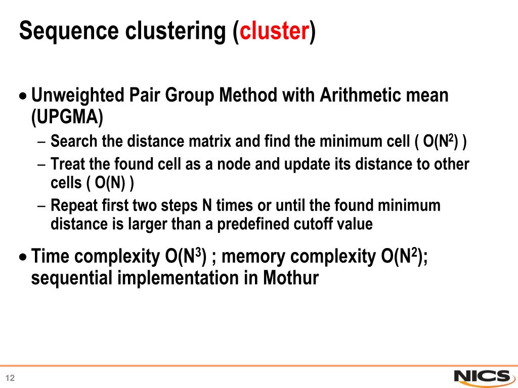 Sequence clustering (cluster) • Unweighted Pair Group Method with Arithmetic mean (UPGMA) • Search the distance matrix and find the minimum cell ( O(N2) ) • Treat the found cell as a node and update its distance to other cells ( O(N) ) • Repeat first two steps N times or until the found minimum distance is larger than a predefined cutoff value • Time complexity O(N3) ; memory complexity O(N2); sequential implementation in Mothur
