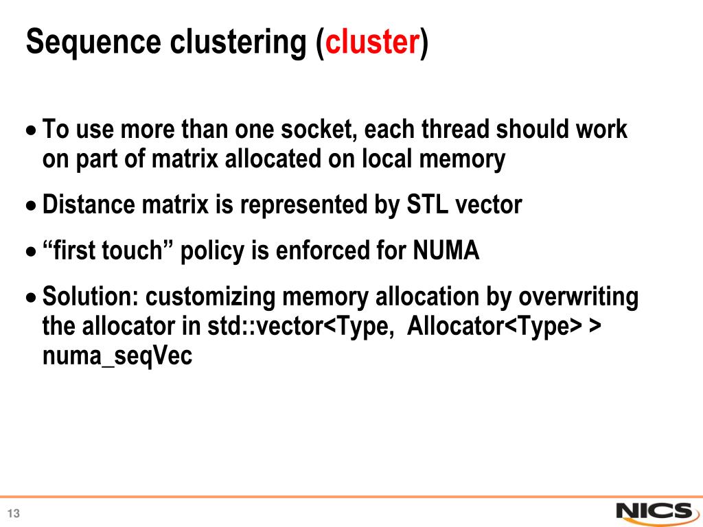 Sequence clustering (cluster) To use more than one socket, each thread should work on part of matrix allocated on local memory Distance matrix is represented by STL vector “first touch” policy is enforced for NUMA Solution: customizing memory allocation by overwriting the allocator in std::vector<Type, Allocator<Type> > numa_seqVec