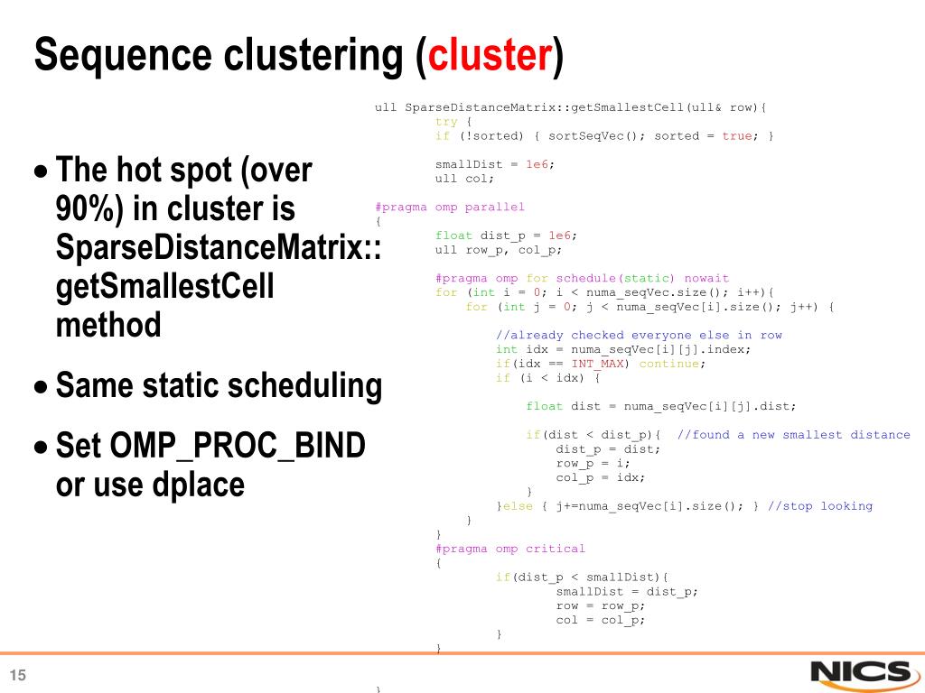 Sequence clustering (cluster) The hot spot (over 90%) in cluster is SparseDistanceMatrix::getSmallestCellmethod Same static scheduling Set OMP_PROC_BIND or use dplace
