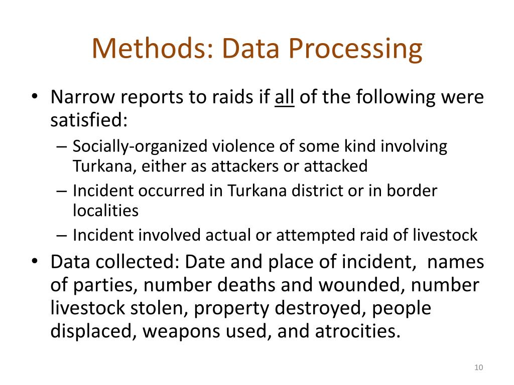Methods: Data Processing • Narrow reports to raids if all of the following were satisfied: • Socially-organized violence of some kind involving Turkana, either as attackers or attacked • Incident occurred in Turkana district or in border localities • Incident involved actual or attempted raid of livestock • Data collected: Date and place of incident, names of parties, number deaths and wounded, number livestock stolen, property destroyed, people displaced, weapons used, and atrocities.