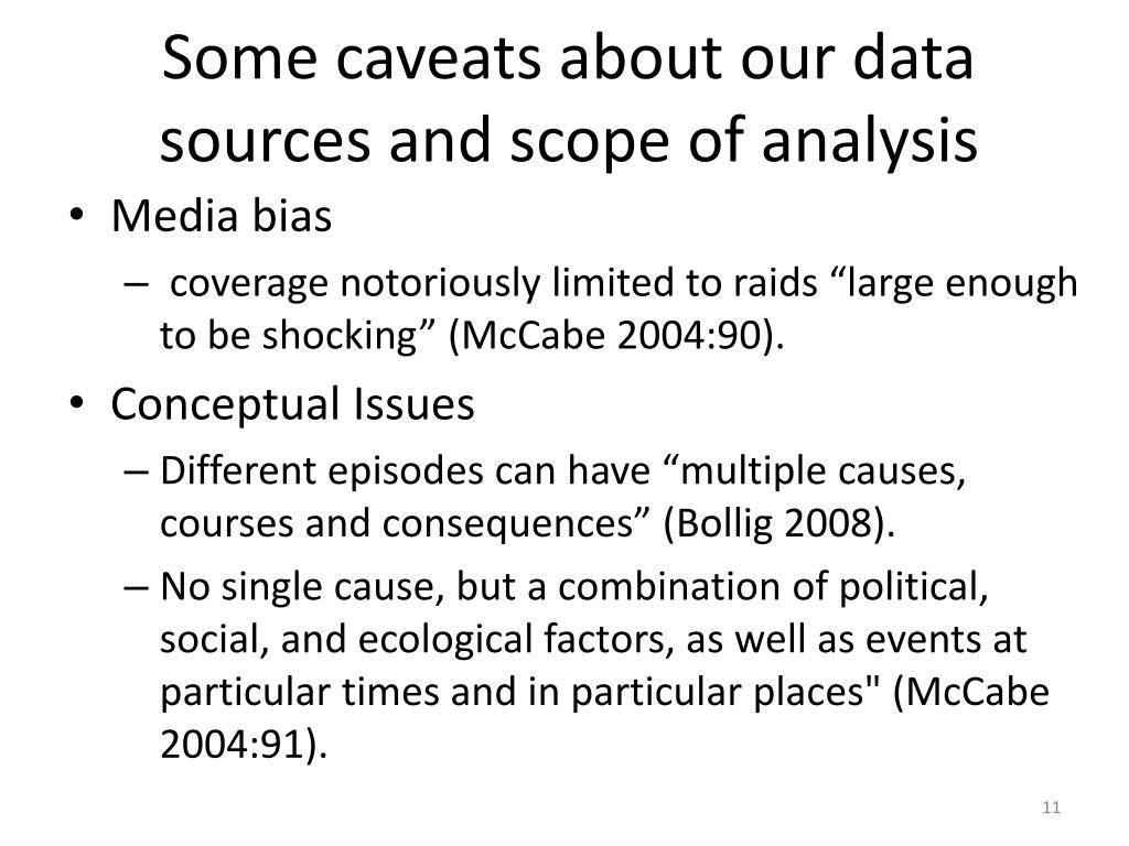 Some caveats about our data sources and scope of analysis • Media bias • coverage notoriously limited to raids “large enough to be shocking” (McCabe 2004:90). • Conceptual Issues • Different episodes can have “multiple causes, courses and consequences” (Bollig 2008). • No single cause, but a combination of political, social, and ecological factors, as well as events at particular times and in particular places" (McCabe 2004:91).