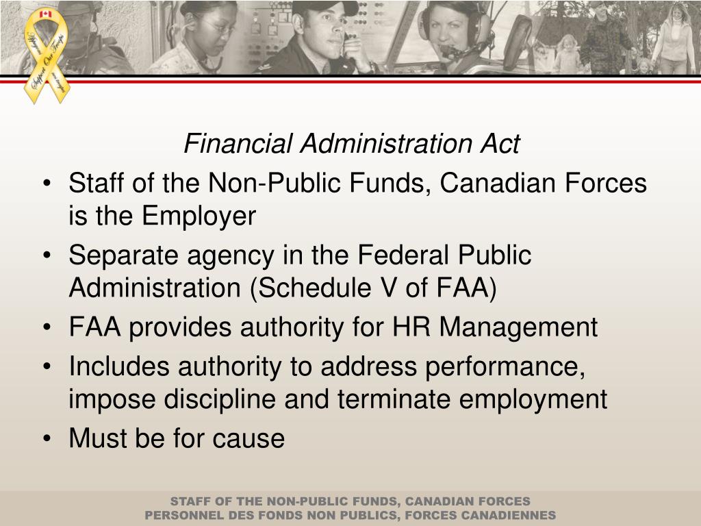 Financial Administration Act • Staff of the Non-Public Funds, Canadian Forces is the Employer • Separate agency in the Federal Public Administration (Schedule V of FAA) • FAA provides authority for HR Management • Includes authority to address performance, impose discipline and terminate employment • Must be for cause
