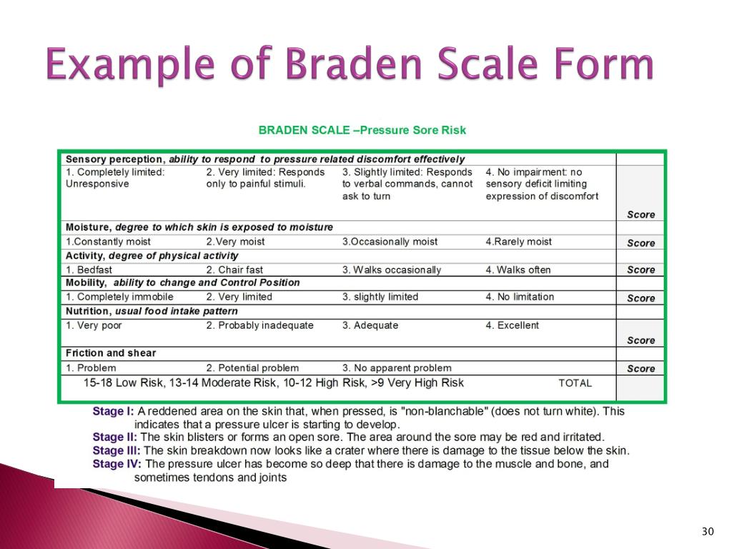 Use of the Braden scale Risk of developing pressure ulcers based on evaluation of six areas: • Sensory perception • Moisture • Activity • Mobility • Nutrition • Friction and shear