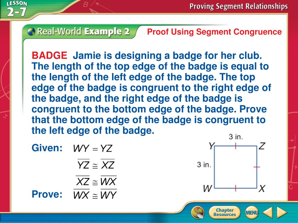 BADGE Jamie is designing a badge for her club. The length of the top edge of the badge is equal to the length of the left edge of the badge. The top edge of the badge is congruent to the right edge of the badge, and the right edge of the badge is congruent to the bottom edge of the badge. Prove that the bottom edge of the badge is congruent to the left edge of the badge. Given: Prove: Proof Using Segment Congruence Example 2
