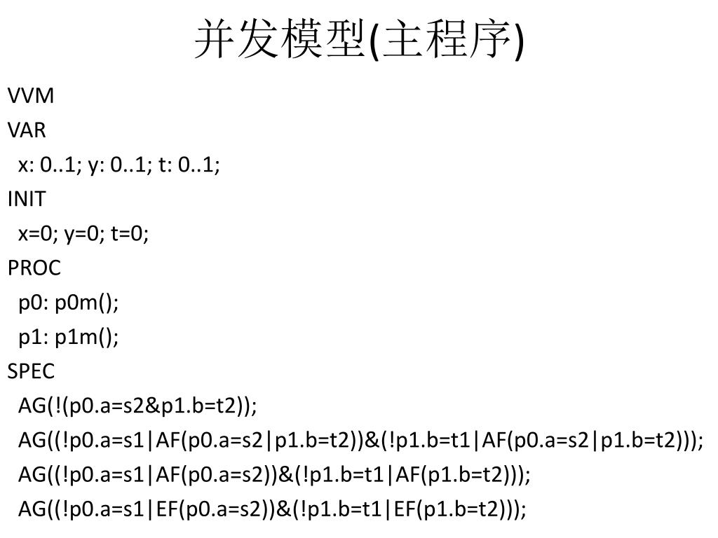 并发模型(主程序) VVM VAR x: 0..1;y: 0..1;t: 0..1; INIT x=0; y=0; t=0; PROC p0: p0m(); p1: p1m(); SPEC AG(!(p0.a=s2&p1.b=t2)); AG((!p0.a=s1|AF(p0.a=s2|p1.b=t2))&(!p1.b=t1|AF(p0.a=s2|p1.b=t2))); AG((!p0.a=s1|AF(p0.a=s2))&(!p1.b=t1|AF(p1.b=t2))); AG((!p0.a=s1|EF(p0.a=s2))&(!p1.b=t1|EF(p1.b=t2)));