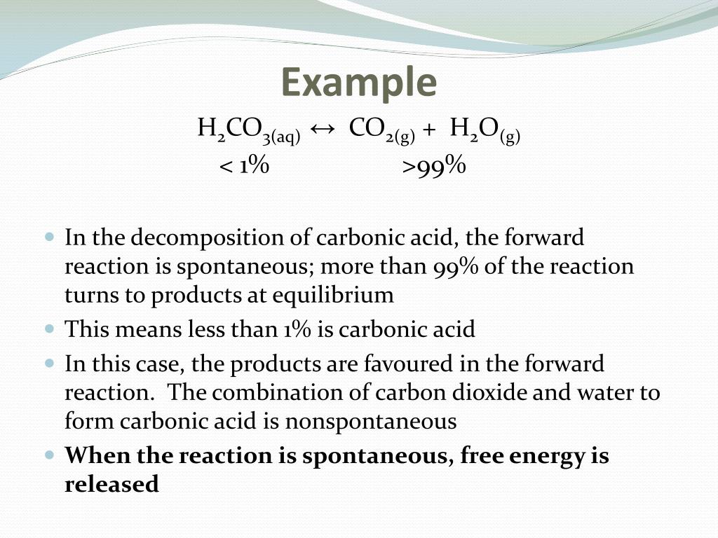 Example H2CO3(aq) ↔ CO2(g) + H2O(g) < 1% >99% • In the decomposition of carbonic acid, the forward reaction is spontaneous; more than 99% of the reaction turns to products at equilibrium • This means less than 1% is carbonic acid • In this case, the products are favoured in the forward reaction. The combination of carbon dioxide and water to form carbonic acid is nonspontaneous • When the reaction is spontaneous, free energy is released