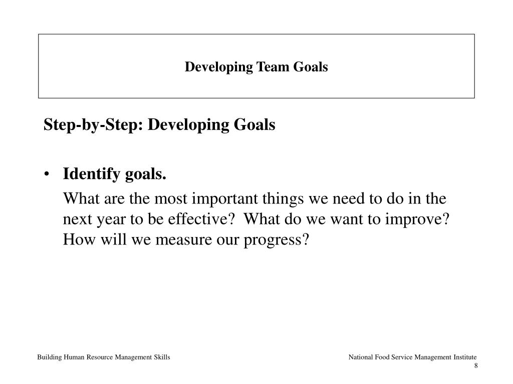 Developing Team Goals Step-by-Step: Developing Goals • Explore team focus areas. What are the issues facing us? Where do we need to be spending our energy to be our best? Building Human Resource Management Skills National Food Service Management Institute 7