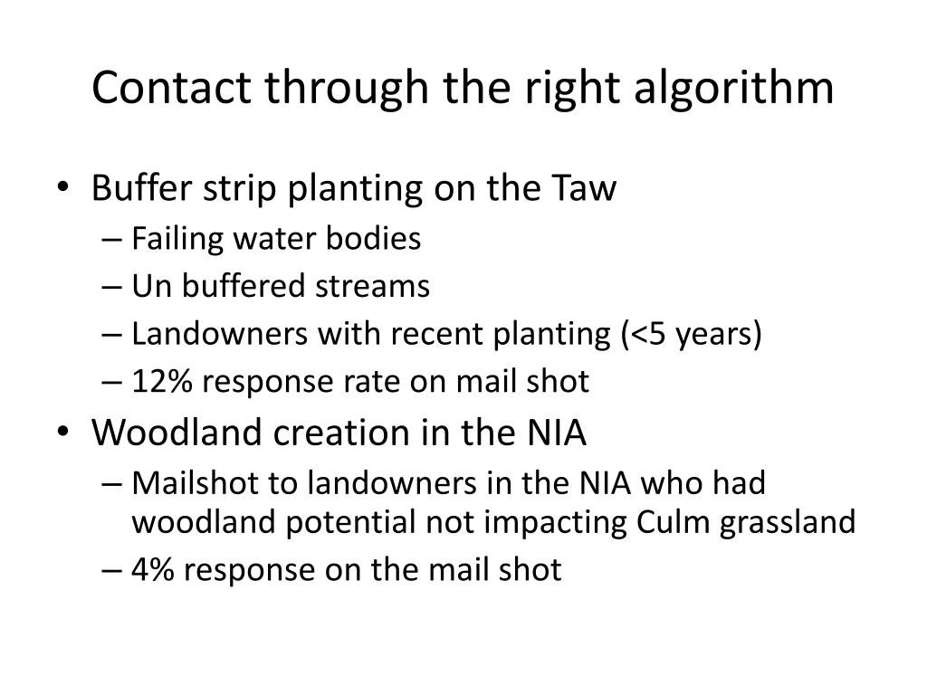Contact through the right algorithm • Buffer strip planting on the Taw • Failing water bodies • Un buffered streams • Landowners with recent planting (<5 years) • 12% response rate on mail shot • Woodland creation in the NIA • Mailshot to landowners in the NIA who had woodland potential not impacting Culm grassland • 4% response on the mail shot