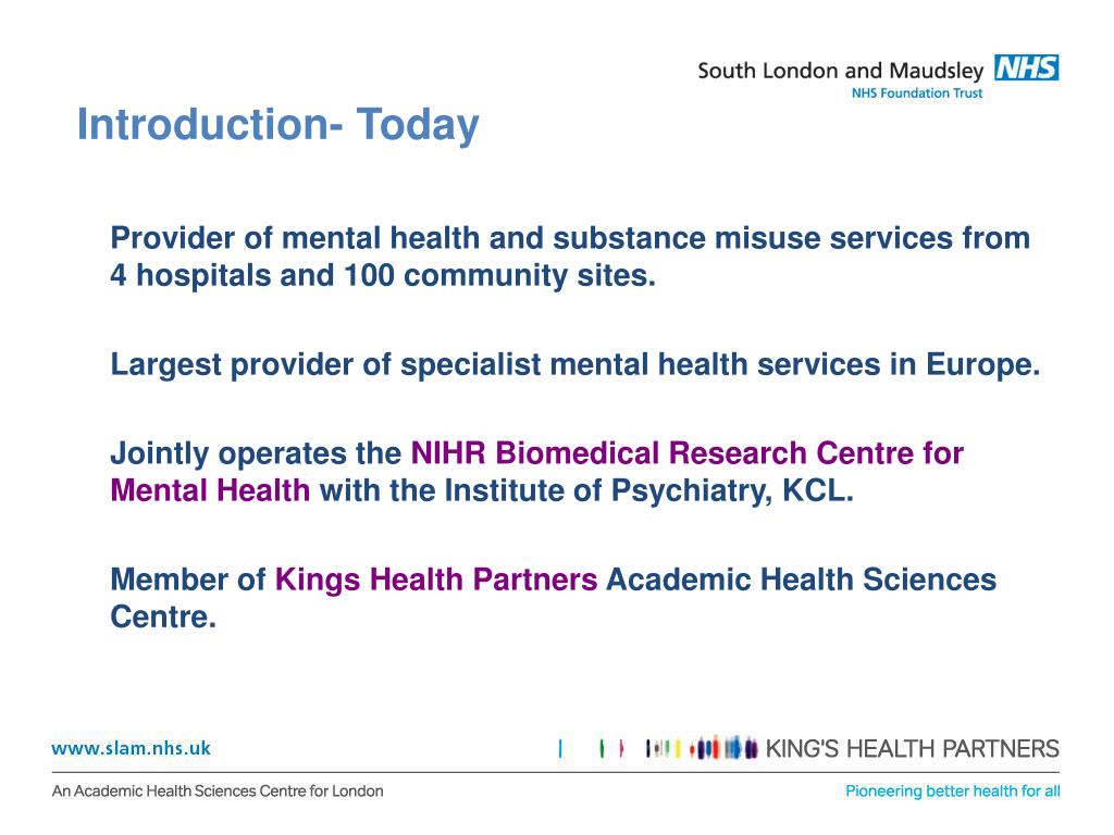Introduction- Today Provider of mental health and substance misuse services from 4 hospitals and 100 community sites. Largest provider of specialist mental health services in Europe. Jointly operates the NIHR Biomedical Research Centrefor Mental Health with the Institute of Psychiatry, KCL. Member of Kings Health Partners Academic Health Sciences Centre.