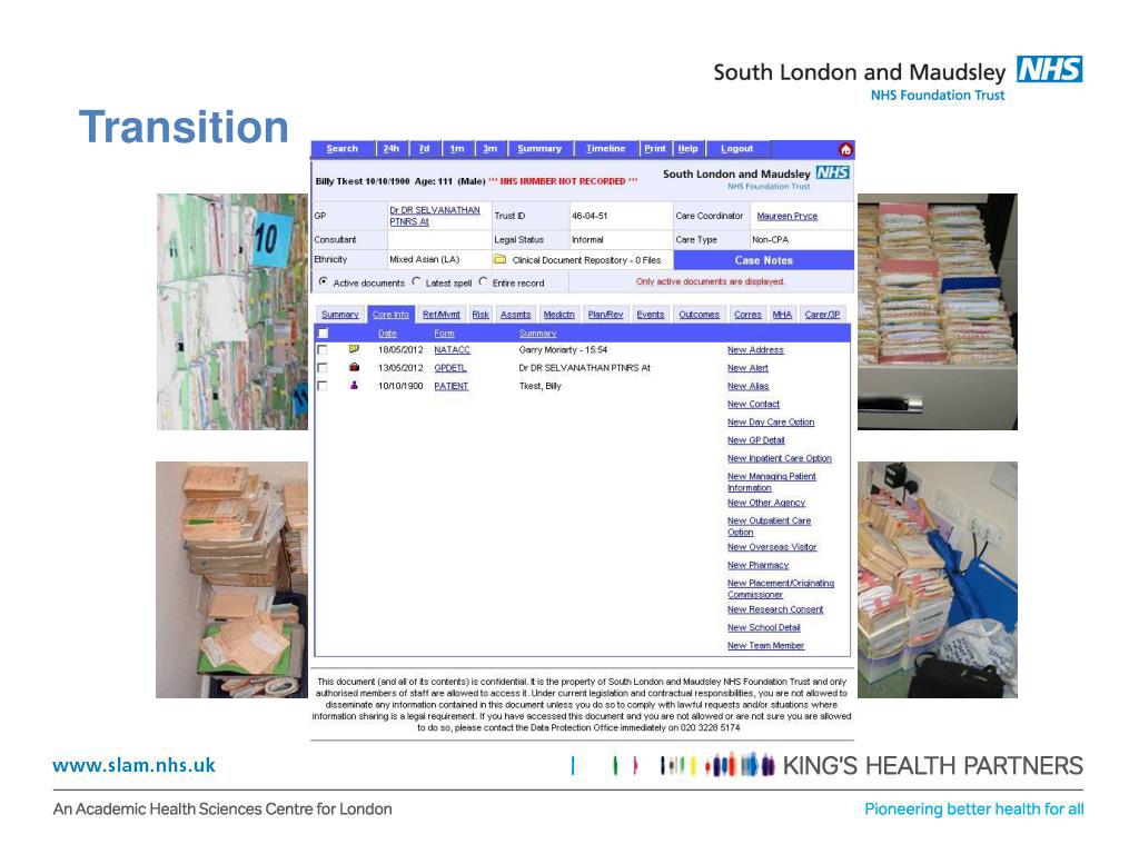 Transition Implemented a single electronic health records system across all clinical services in 2006. ePJS • Tailored to the needs of services • 200,000 health records • Electronic records directly linked to legacy records • Reporting tools for better data quality, improved outcomes and regulatory compliance CRIS • Informatics to make best use of clinical information • Enabling research • Effective anonymisation/pseudonymisation