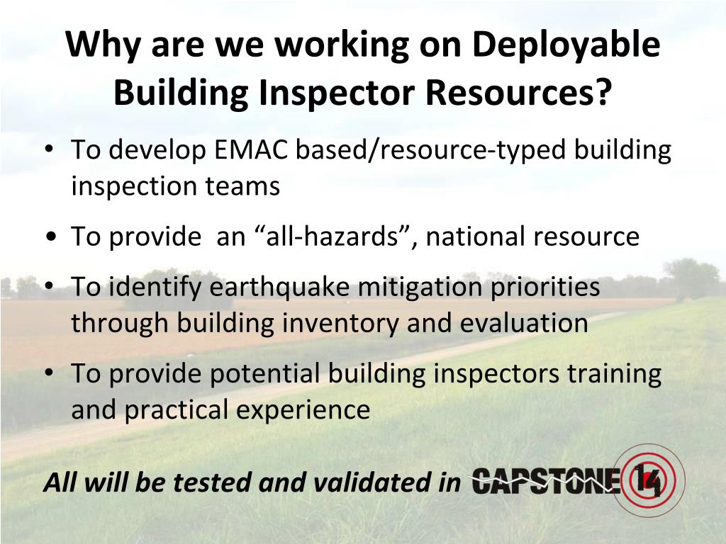 Why are we working on Deployable Building Inspector Resources? • To develop EMAC based/resource-typed building inspection teams • To provide an “all-hazards”, national resource • To identify earthquake mitigation priorities through building inventory and evaluation • To provide potential building inspectors training and practical experience All will be tested and validated in